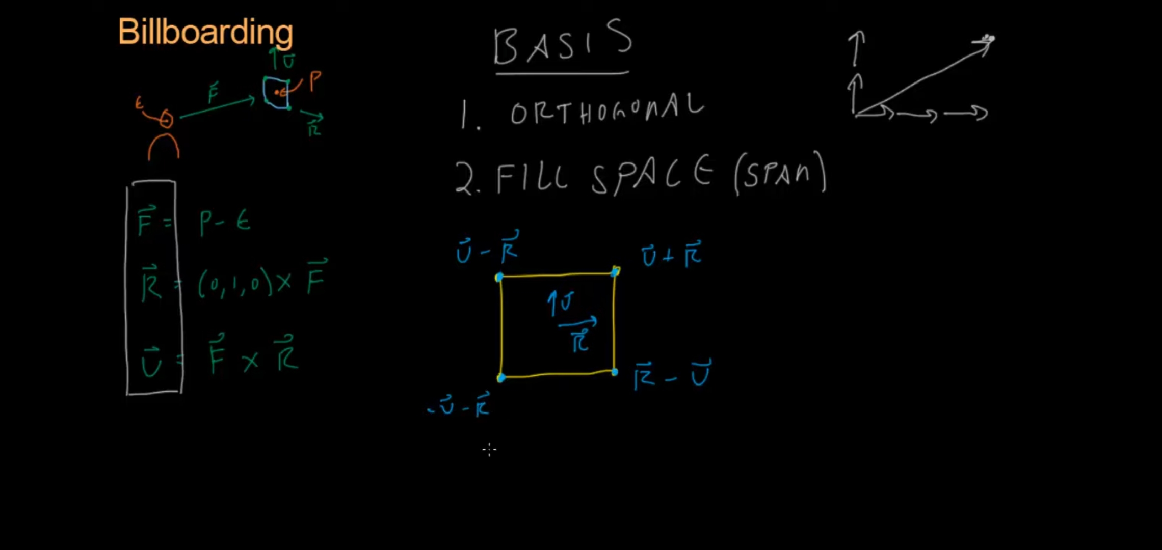 (여기서 F와 외적중인 벡터가 (0,1,0), 즉 global한 up vector임을 기억하자. U벡터는 스프라이트 자체의 상대좌표계상에서의 up벡터를 의미한다.)