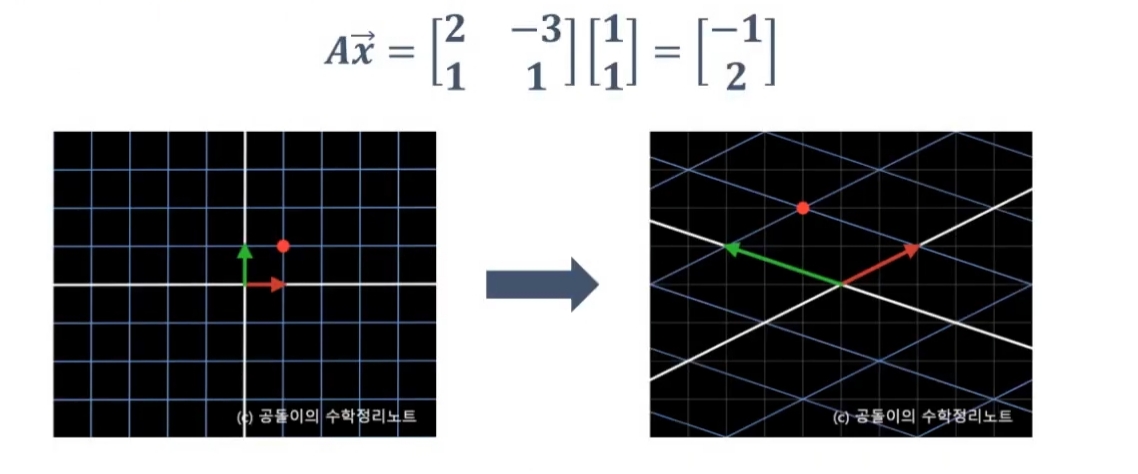 위 행렬곱 연산은 자세히 보면 기저벡터가 (1,0),(0,1)이었던 좌표계의 점(벡터) 1,1을 기저벡터가 (2,1),(-3,1)인 죄표계의 점 1,1로 변환한 후 그 좌표를 다시 기저벡터가 (1,0),(0,1)인 좌표계에 대해 나타낸 것이라는 것을 알 수 있다.