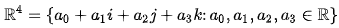 실수부는 스칼라값 하나 (w), 허수부는 어떤 크기 3인 실수값을 원소로 가지는 벡터에 허수 i,j,k를 벡터의 각 원소에 곱해준 형태이다. (v)