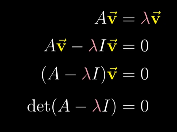 계산 결과만 살펴보면, 고유값 람다를 구하기 위해서는 det(A - λI) = 0 방정식의 해 람다를 구하면 된다.