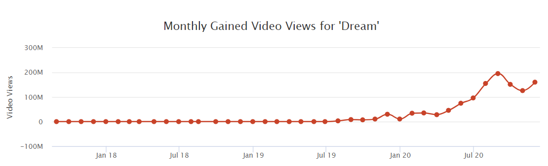 Dream의 유튜브 조회수를 보면, 2020년 6월 약 110회의 조회수를 기록한 반면, 한 달 후인 2020년 7월 약 300만 회의 조회수를 기록하면서 급속도로 성장하기 시작했습니다. 고작 두 달 후인 2020년 8월에는 월 조회수 2억을 달성하며 세계 최정상 유튜버 중 하나로 자리잡게 되었습니다.