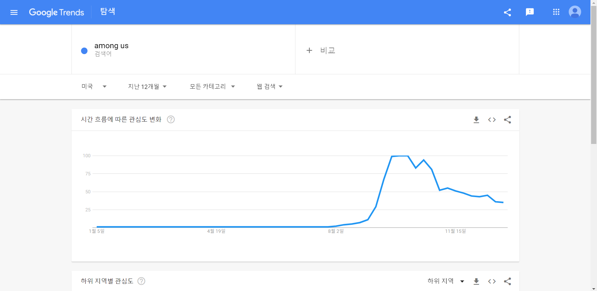 어몽어스의 구글 트렌드 결과를 살펴보면 Corpse husband 채널의 성장과 마찬가지로 9월과 10월 사이를 기점으로 급격하게 인지도가 높아진 것을 확인할 수 있습니다. 이는 게임과 스트리머의 인지도 순환이 불러온 결과라고 생각됩니다.