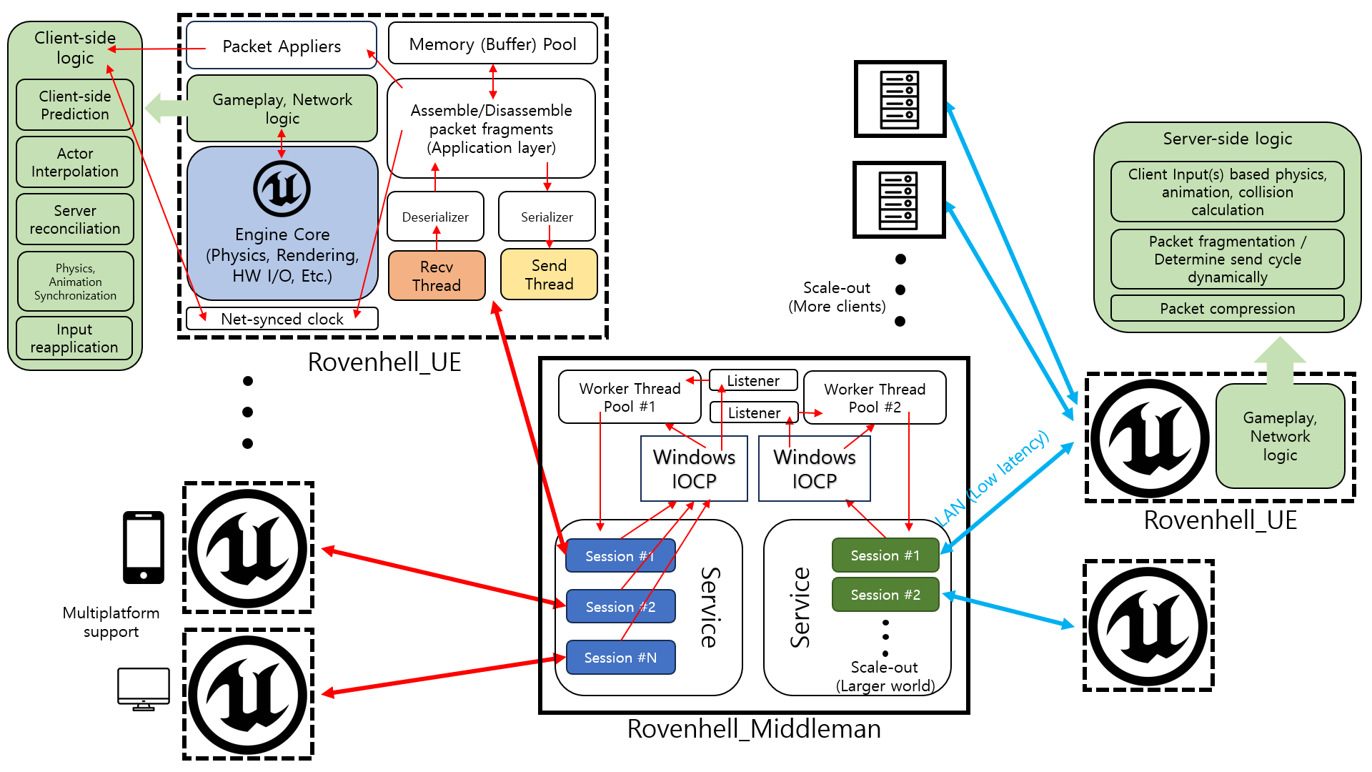 로벤헬은 이동, 충돌 연산까지 Server authoritative하게 처리하는 것을 목표로 하고 개발되었기 때문에 데디케이티드 서버를 사용합니다. 즉 통상적인 MMO(RPG) 아키텍처와는 거리가 있습니다. 하지만 세션 단위 게임이 아닌 MMO를 지향하기 때문에 서버의 지속가능성과 Scale-out을 염두에 두며 구조를 설계했고, 데디케이티드 서버 여러 대가 전체 서버 부하를 분산해 처리하는 구조를 목표로 제작되었습니다. 때문에 언리얼 자체 기능인 Replication 대신, 커스텀 넷코드를 작성해 사용했습니다.