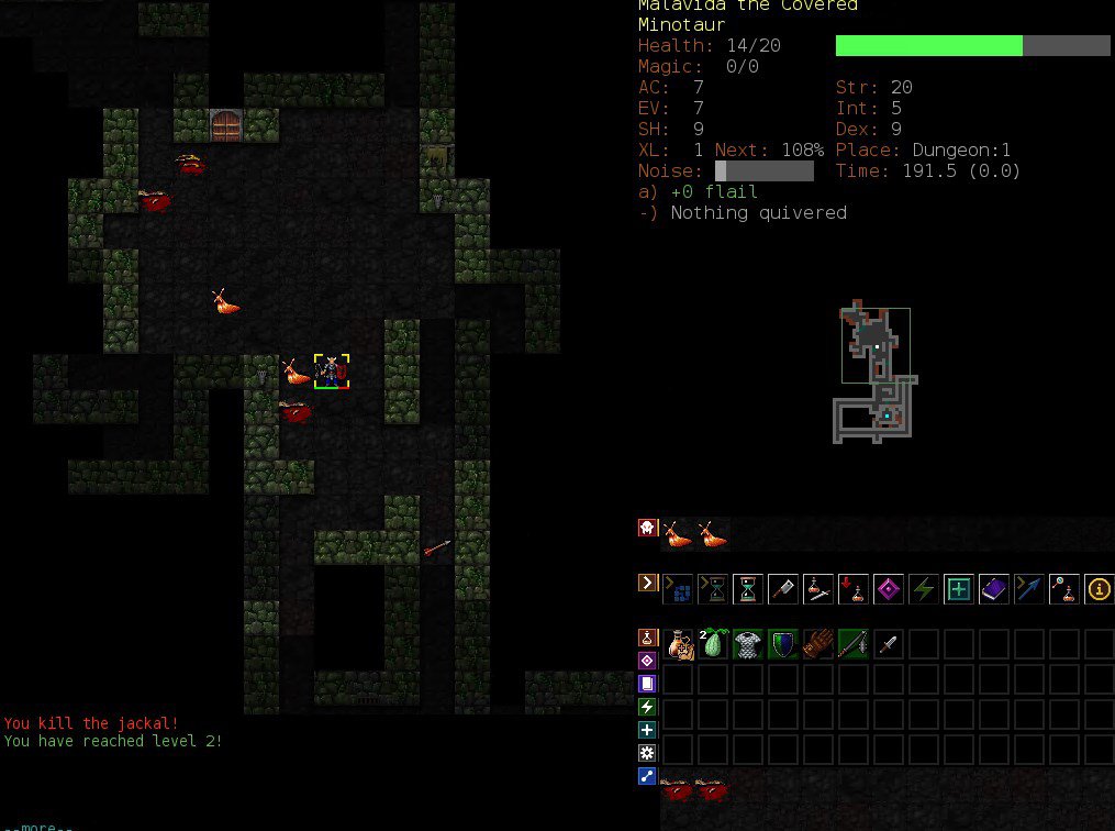 여러분은 아무런 아이템도 가지지 않은 채(혹은 아주 기본적인 아이템만 가진채) 알 수 없는 던전의 한복판에서 게임을 시작합니다. 대부분의 로그라이크 게임에는 허기 시스템이 존재하기 때문에, 여러분은 좋든 싫든 스스로 맵을 탐험해 나가며 음식을 구하고 정보를 얻어야 합니다.